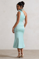 Mint Satin One Shoulder High-Neck Flared Midi DressOur newest midi Golden Girl is the perfect pick for any special event. Its delicate draping and soft mint satin makes it an elegant option for race days, weddings and everything in between. Golden Girl is finished with a soft peplum hem and open-back.Features - Premium stretch satin-...