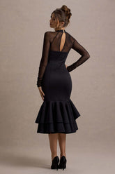 Black Mesh Long-Sleeve Ruffle-Hem Midi DressDefined by its striking textures and bold silhouette, Sander is the ultimate choice for a sophisticated night out. Crafted from luxurious mesh and sculpting scuba foam, this black midi dress features long sheer sleeves that balance elegance with allure. The design is finished with...