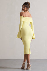 Lemon Bardot Flared-Sleeve Midi DressLook effortlessly elegant in Emma, a must have midi for the upcoming event season. Designed in our figure hugging scuba crepe in a light lemon shade, this bodycon dress boasts a classic bardot neckline with flattering flared sleeves. Style Emma with a tousled bun...