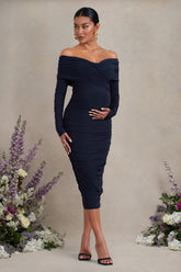 Navy Ruched Twist Bardot Long-Sleeve Maternity Midi DressCurate a wardrobe of luxurious maternity staples starting with Davina, our rich navy midi. Wrapped in flattering ruching, this bodycon boasts a twisted bardot neckline, long sleeves and split hemline for ease of movement. Accompanied by a sleek bun and gold earrings, Davina would make for an...