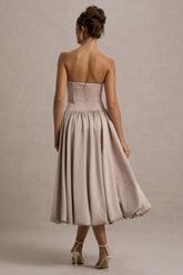 Champagne Satin Bandeau Midi DressEffortlessly elegant, Keyton is a stand-out staple. Expertly designed in a soft champagne shade of our luxurious satin, this strapless midi dress boasts a boned corset bodice and flattering dipped waistline. Complete with a puffball skirt, whats not to love with Keyton?Features - Premium...