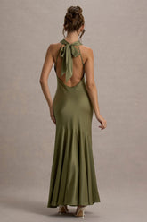 Khaki Satin Cowl-Neck Maxi DressImmerse yourself in a timeless sophistication no matter the occasion with Amelita. Designed in a deep khaki shade of our premium satin, this maxi dress boasts a self-tie halter neckline, sultry open back and adjustable cami straps for the perfect custom fit. Features - Premium...