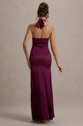 Burgundy Satin Cross Halter-Neck Plisse Maxi DressSculpt your silhouette in our striking maxi, Sansa. Wrapped in a dreamy burgundy satin, this floor-sweeper commands attention through its crossed halter neckline, plisse detailing and sultry split skirt. For a stunning bridesmaid look, we would style Sansa with some timeless golden earrings like...