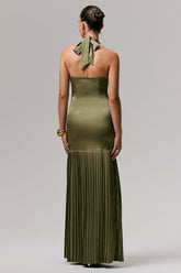 Khaki Satin Cross Halter-Neck Plisse Maxi DressSculpt your silhouette in our striking maxi, Sansa. Wrapped in a dreamy khaki satin, this floor-sweeper commands attention through its crossed halter neckline, plisse detailing and sultry split skirt. For a stunning bridesmaid look, we would style Sansa with some timeless golden earrings like...
