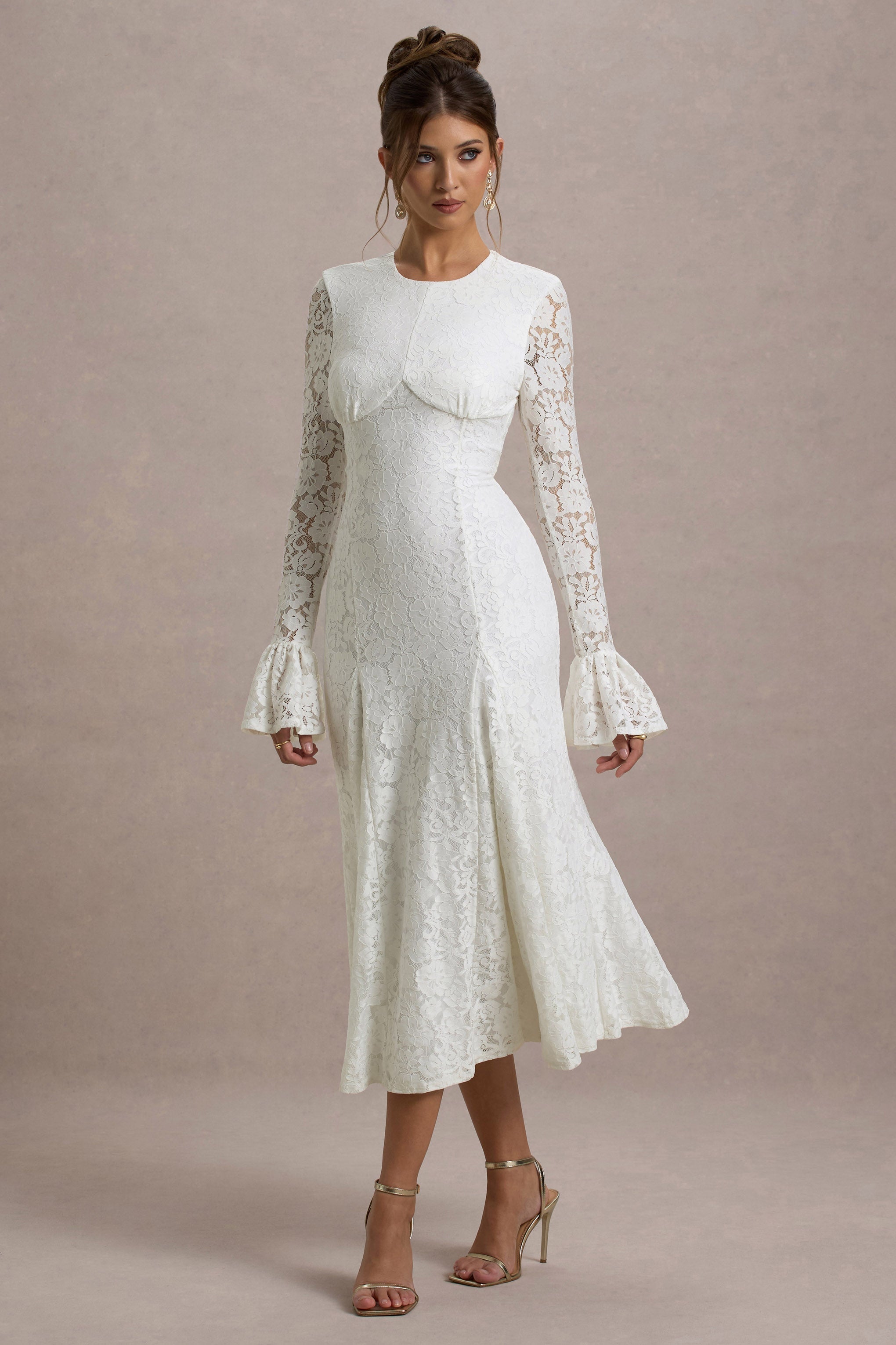 Defined by timeless elegance and intricate craftsmanship, For Life is the ultimate statement piece for your most memorable occasions. Made from our premium lace, this cream long-sleeve midi dress features delicate patterns that create an alluring contrast against the skin. The sophisticated silhouette is enhanced by its subtle sheer sleeves, bringing just the right amount of drama. For Life pairs perfectly with a sleek clutch and classic pumps for a look that exudes confidence and grace.