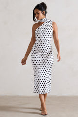 Our newest midi Golden Girl is the perfect pick for any special event. Its delicate draping and white polka dot satin makes it an elegant option for race days, weddings and everything in between. Golden Girl is finished with a soft peplum hem and open-back.